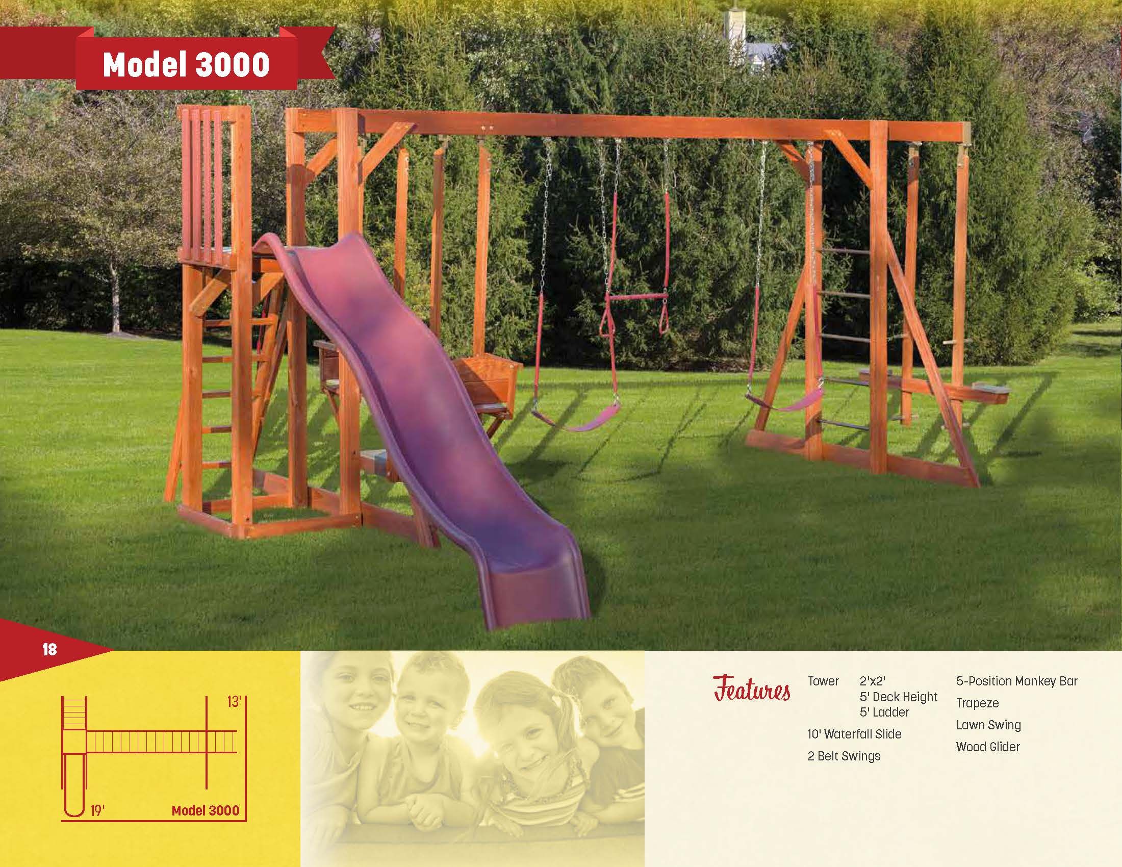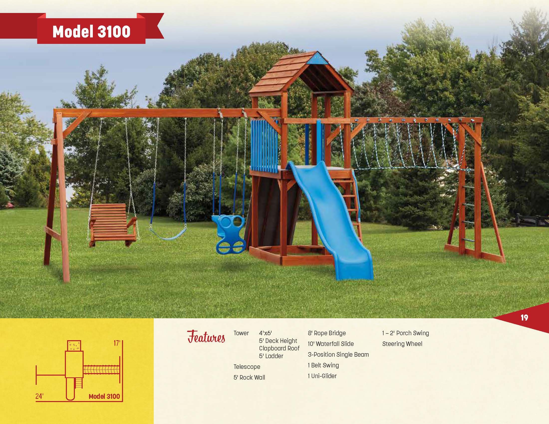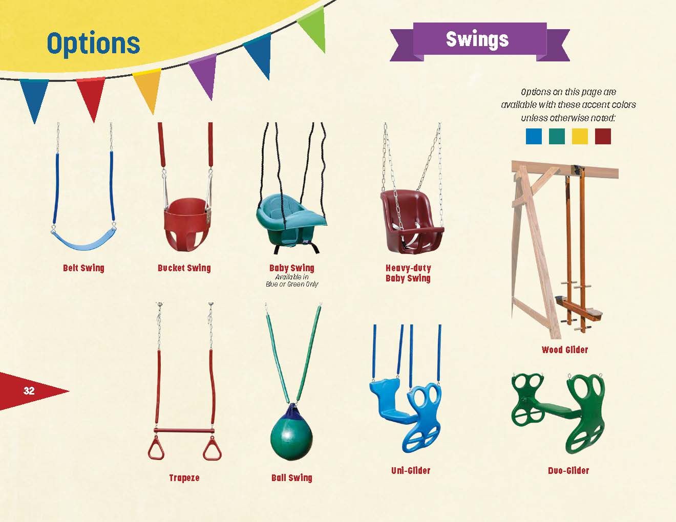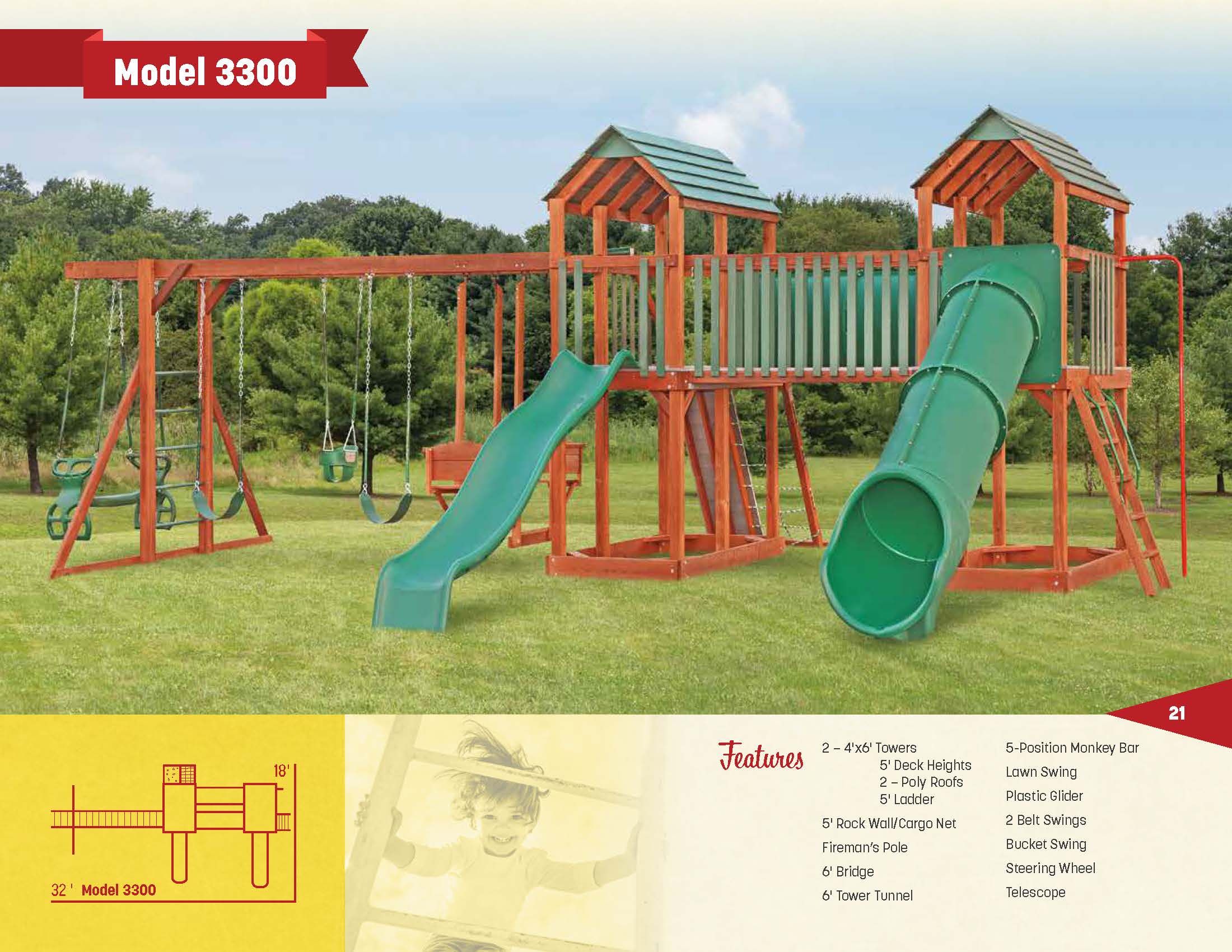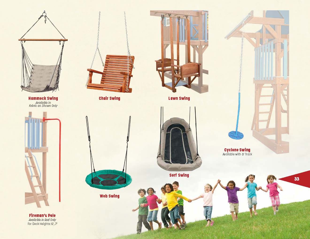 Our swingsets are constructed of No. 1 Grade Southern Yellow Pine that has been pressure treated and kiln dried. All of our lumber is molded for a smooth surface and corners are rounded so there are no sharp edges. Composite decking is used on all exposed floors. All metal components such as glider brackets, handrails, fireman’s poles, and monkey bar dowels are powder-coated for a beautiful, long-lasting finish. Swings have heavy-duty rubber grip chains. Plastic gliders and slides are constructed of durable, heat-resistant plastic. All swingsets are stained with an attractive redwood stain.