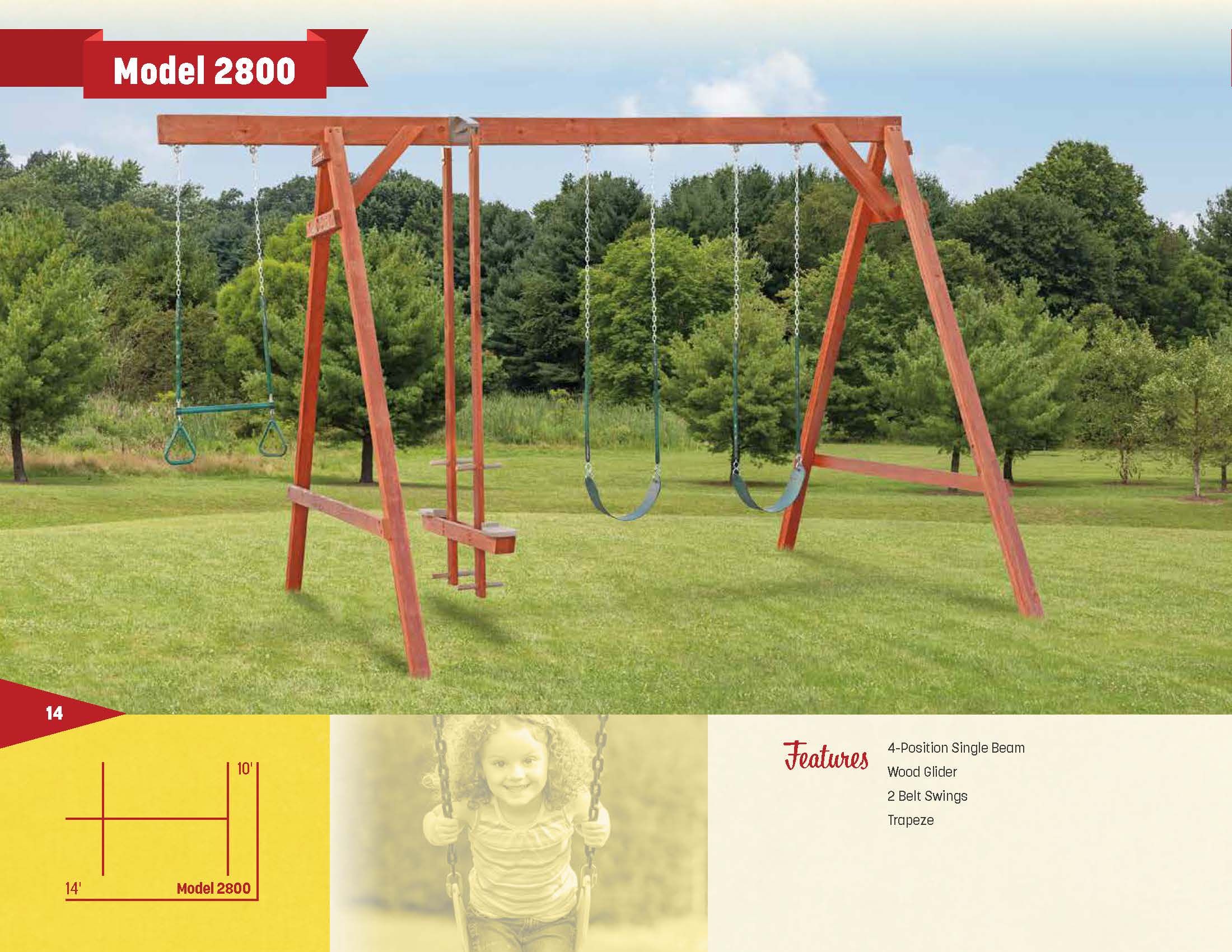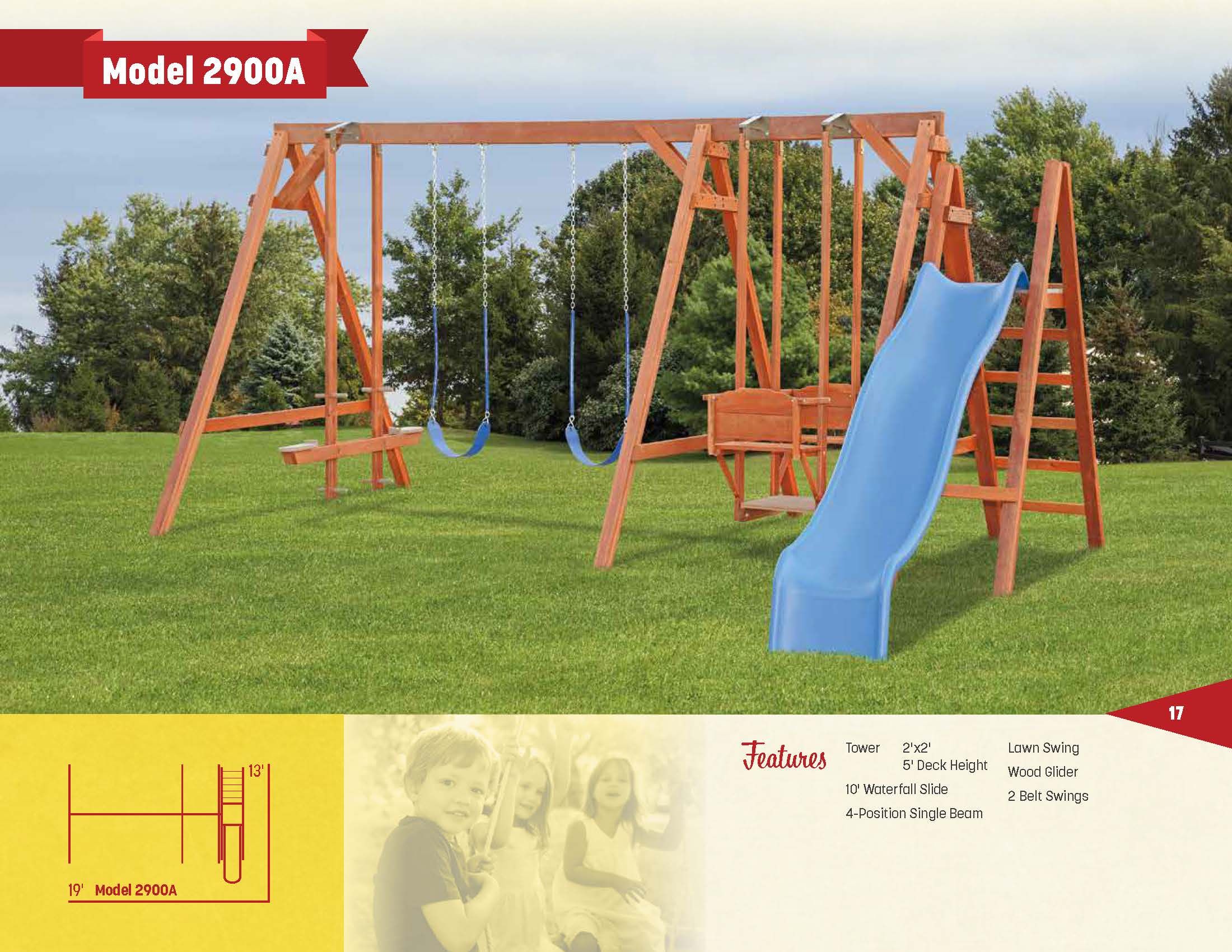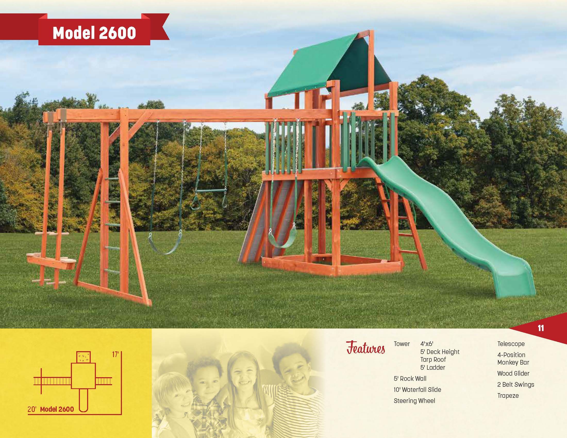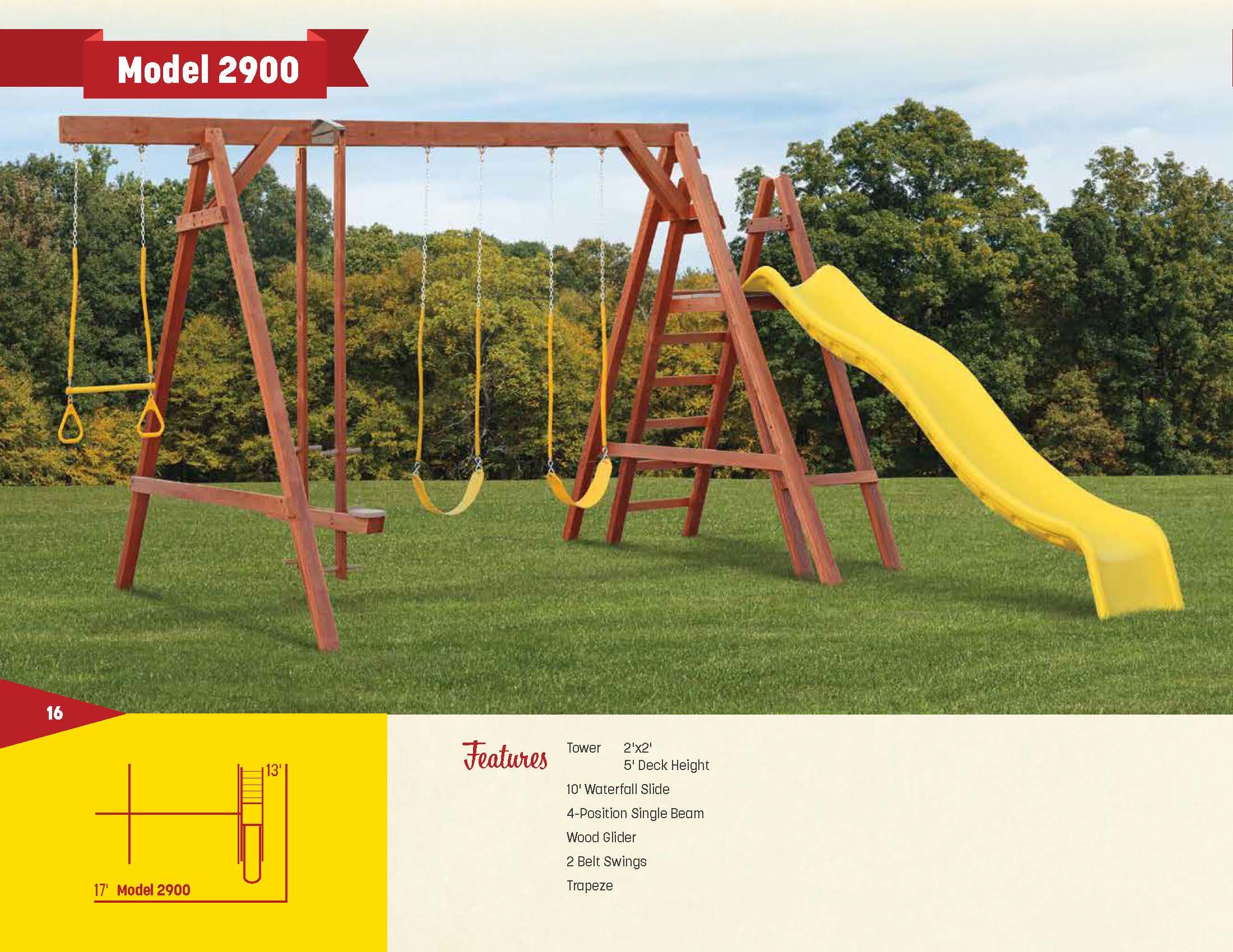 Our swingsets are constructed of No. 1 Grade Southern Yellow Pine that has been pressure treated and kiln dried. All of our lumber is molded for a smooth surface and corners are rounded so there are no sharp edges. Composite decking is used on all exposed floors. All metal components such as glider brackets, handrails, fireman’s poles, and monkey bar dowels are powder-coated for a beautiful, long-lasting finish. Swings have heavy-duty rubber grip chains. Plastic gliders and slides are constructed of durable, heat-resistant plastic. All swingsets are stained with an attractive redwood stain.