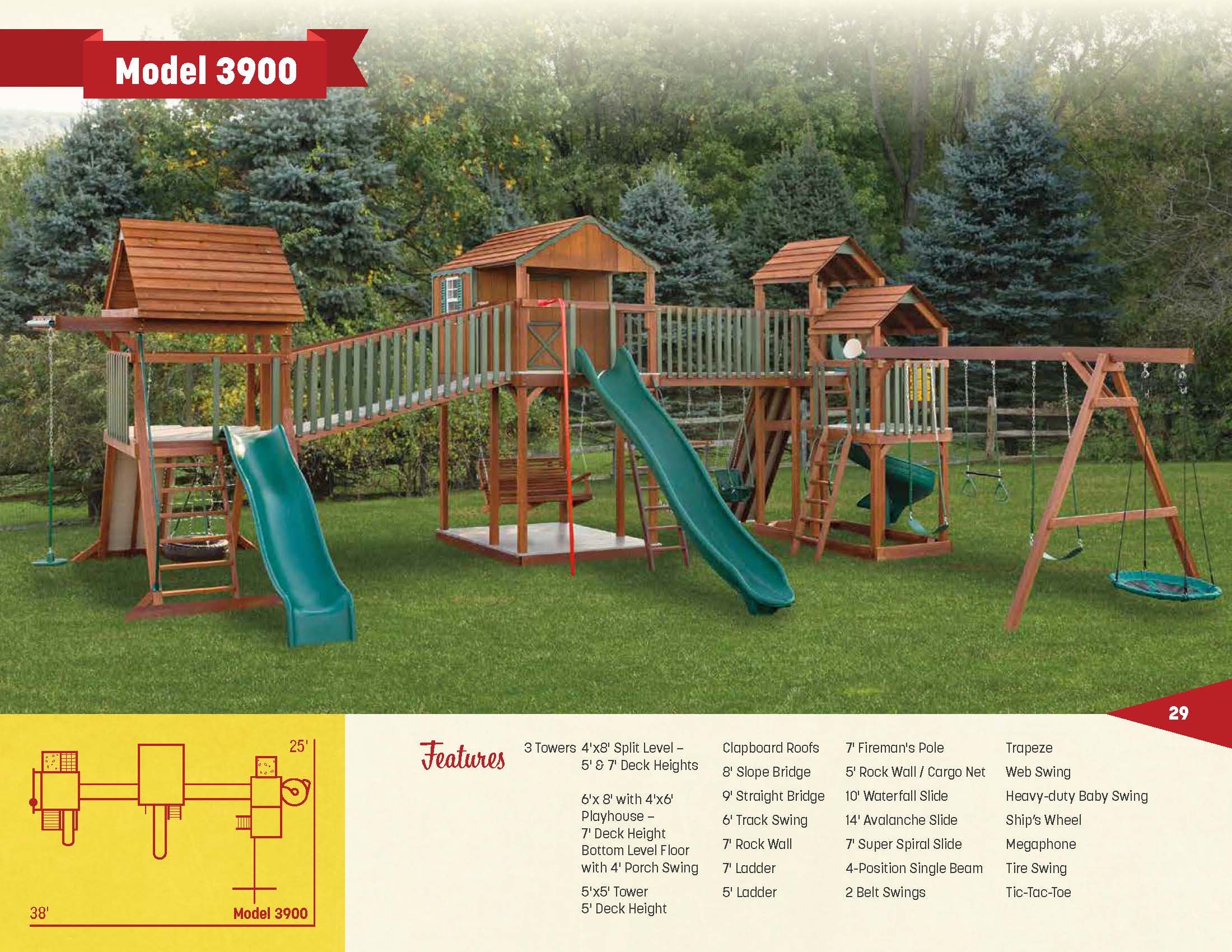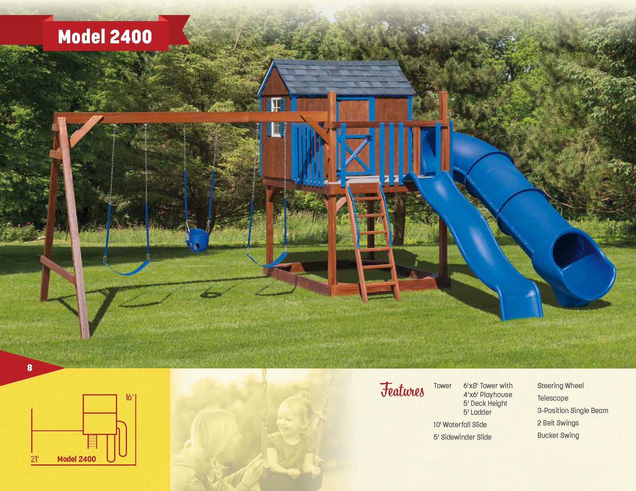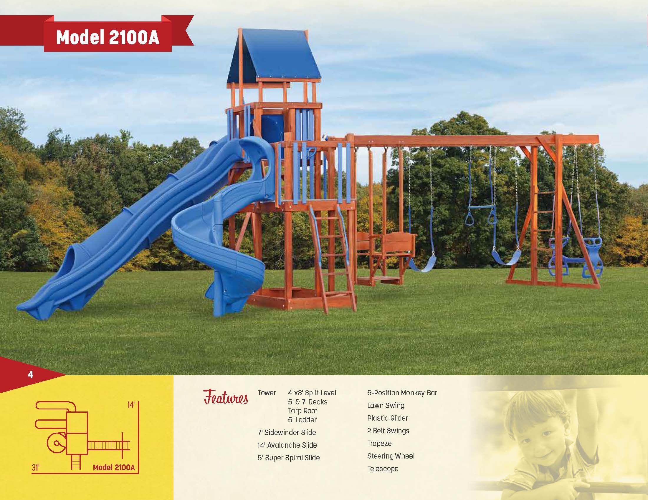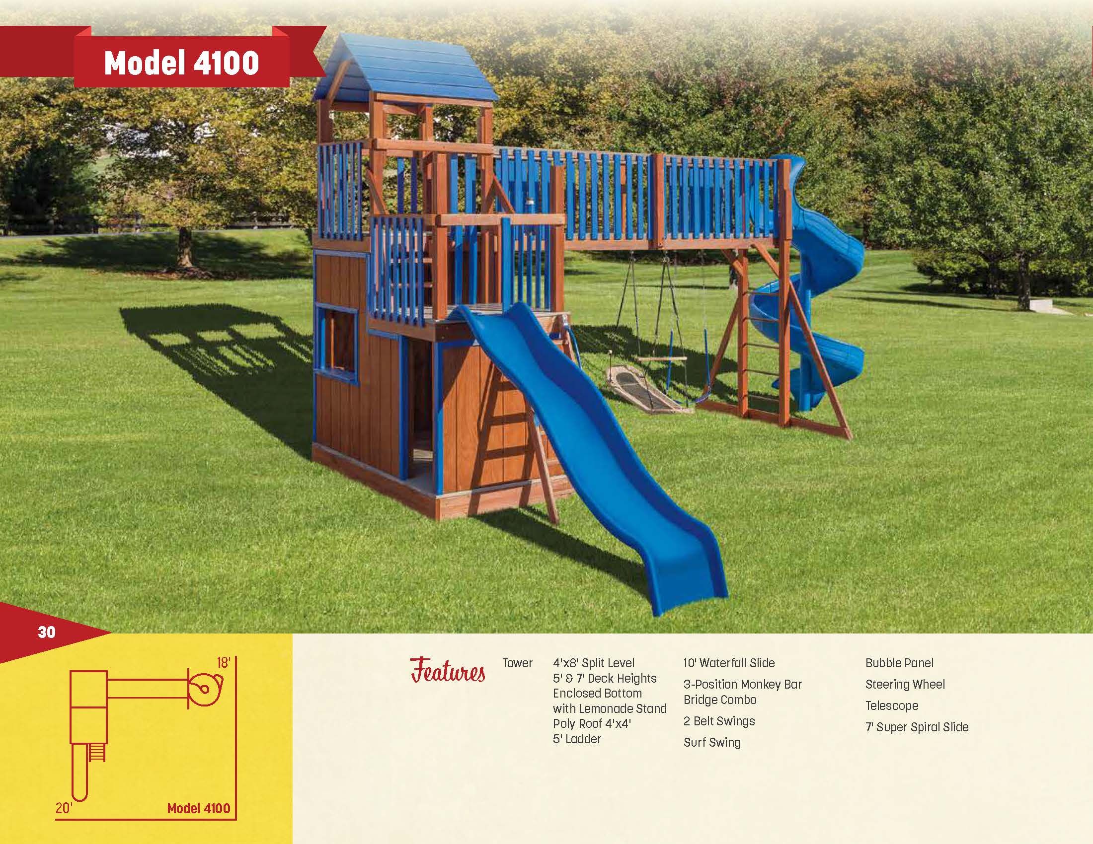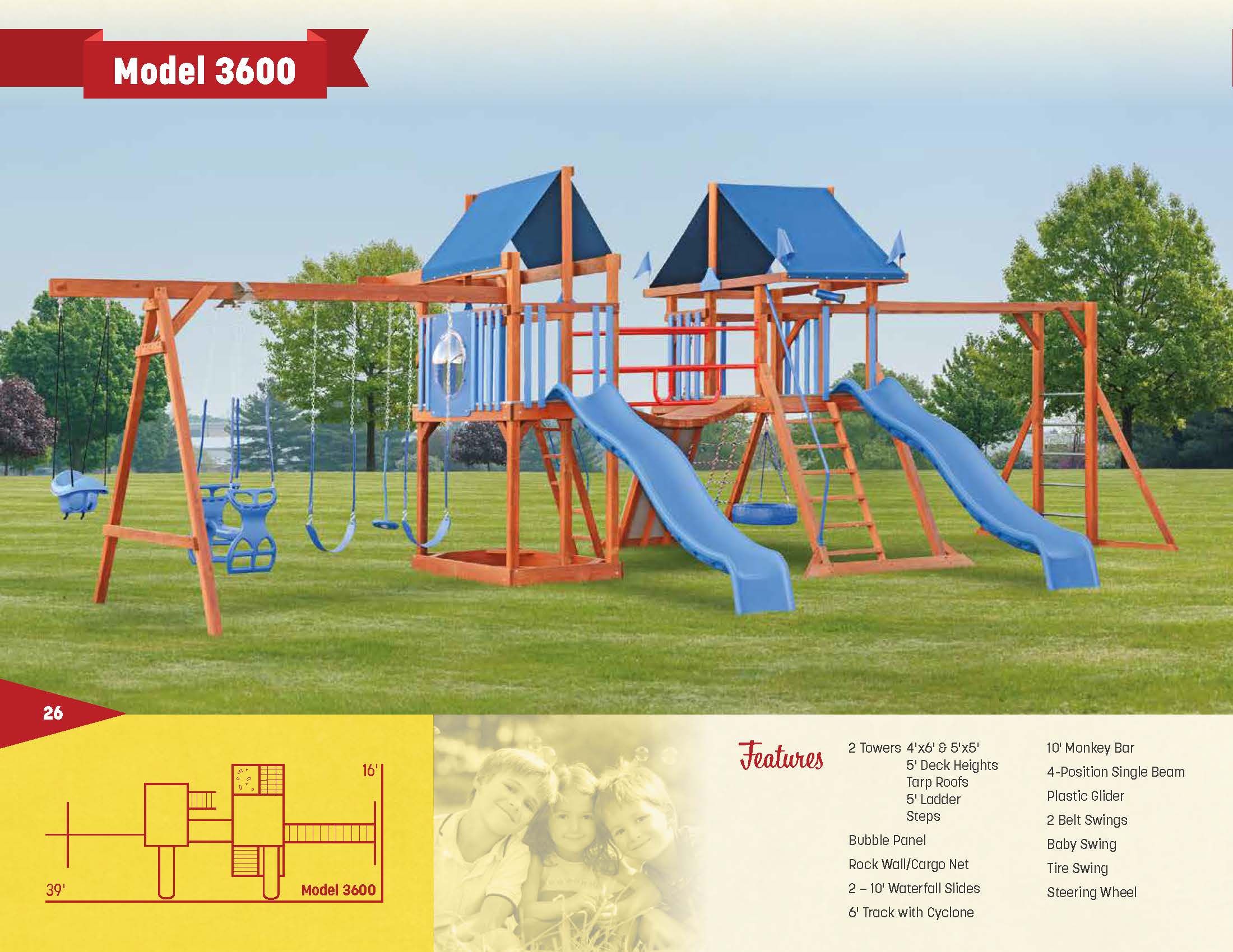 Our swingsets are constructed of No. 1 Grade Southern Yellow Pine that has been pressure treated and kiln dried. All of our lumber is molded for a smooth surface and corners are rounded so there are no sharp edges. Composite decking is used on all exposed floors. All metal components such as glider brackets, handrails, fireman’s poles, and monkey bar dowels are powder-coated for a beautiful, long-lasting finish. Swings have heavy-duty rubber grip chains. Plastic gliders and slides are constructed of durable, heat-resistant plastic. All swingsets are stained with an attractive redwood stain.