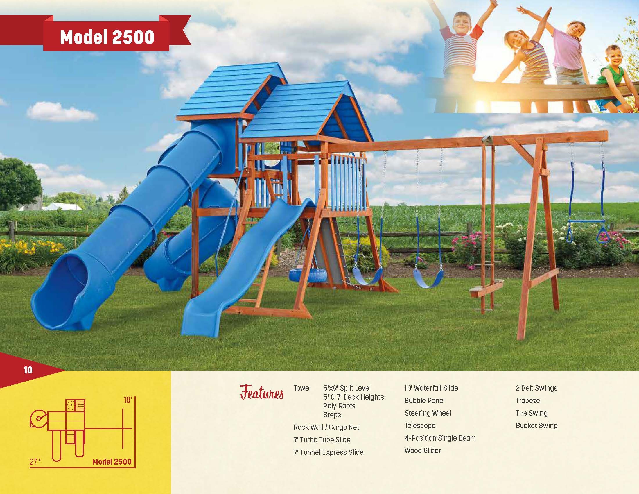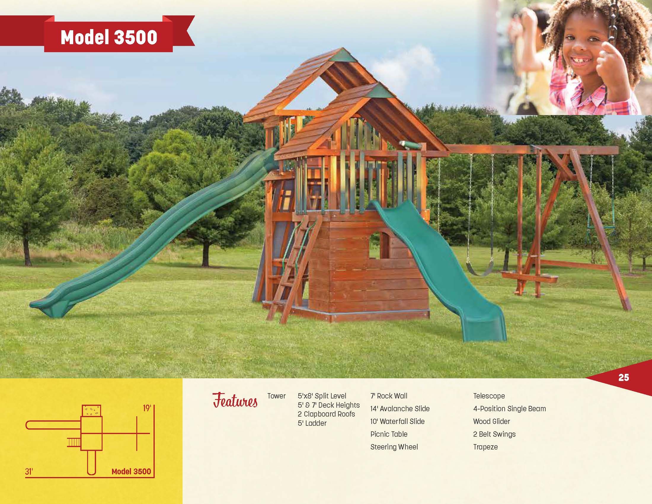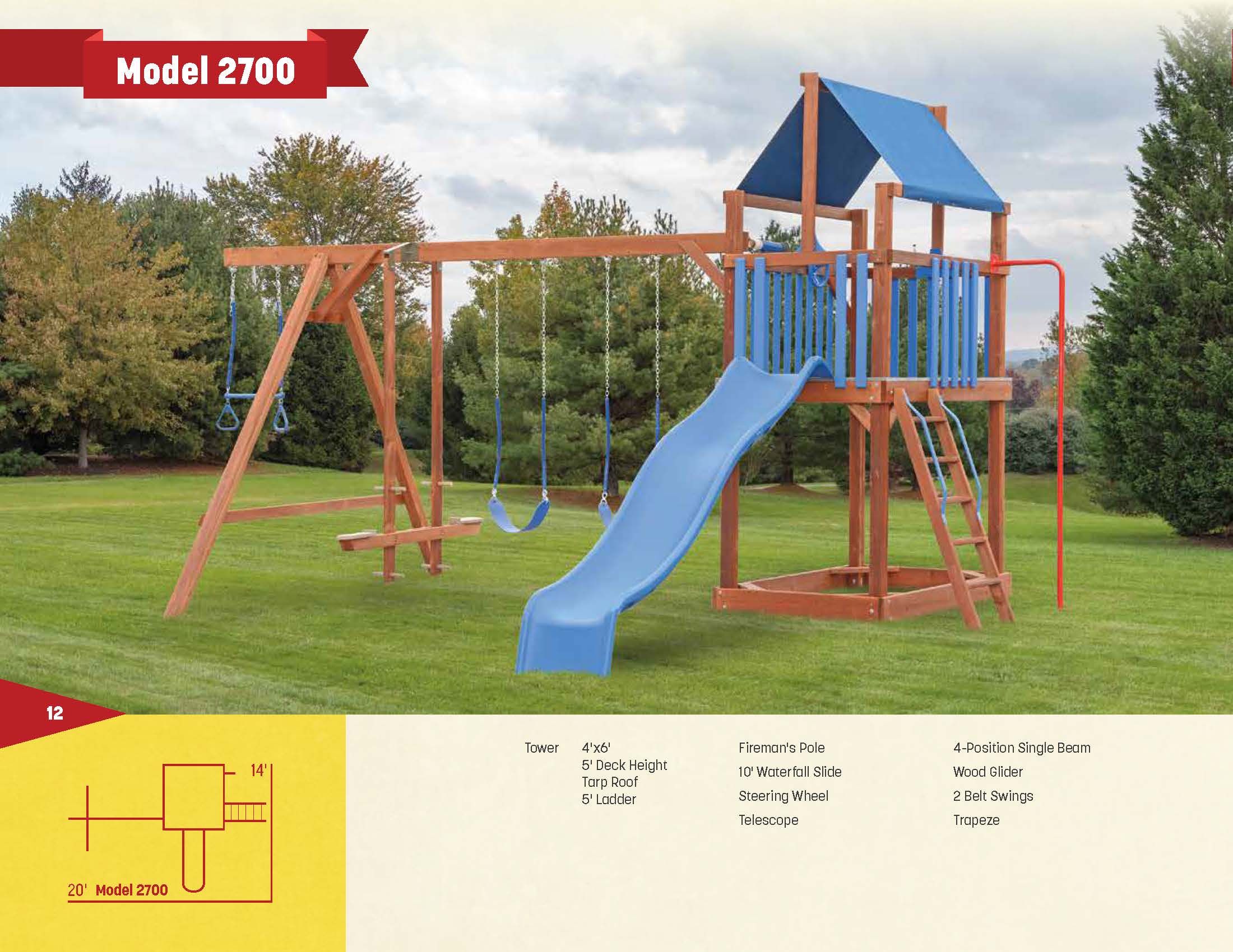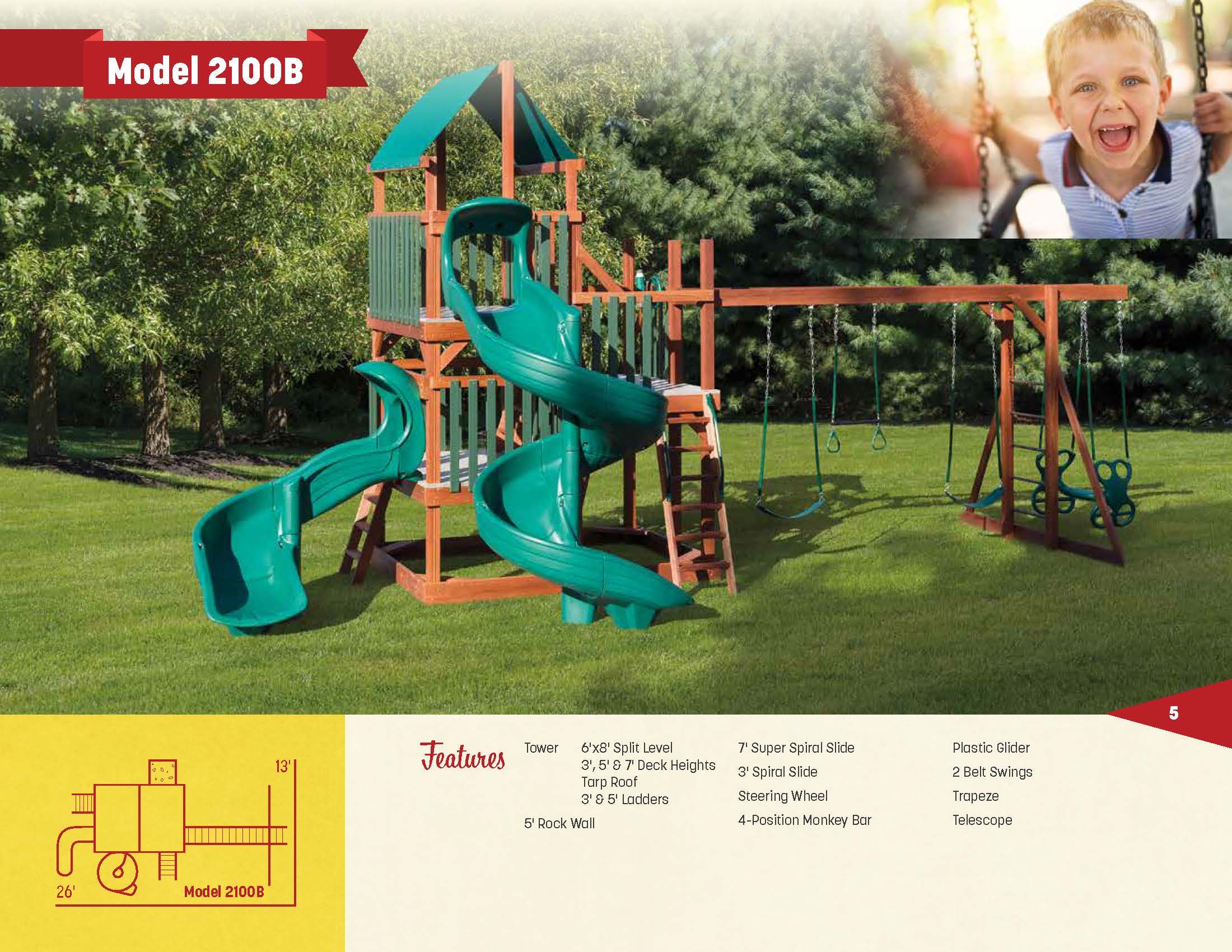 Our swingsets are constructed of No. 1 Grade Southern Yellow Pine that has been pressure treated and kiln dried. All of our lumber is molded for a smooth surface and corners are rounded so there are no sharp edges. Composite decking is used on all exposed floors. All metal components such as glider brackets, handrails, fireman’s poles, and monkey bar dowels are powder-coated for a beautiful, long-lasting finish. Swings have heavy-duty rubber grip chains. Plastic gliders and slides are constructed of durable, heat-resistant plastic. All swingsets are stained with an attractive redwood stain.
